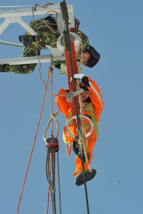 威海冬季雪霧天密集,山東威海供電公司作業(yè)人員趁著難得的雪晴天開展高空作業(yè),對區(qū)域內(nèi)所有的220千伏備用線路進行消缺,為主網(wǎng)安全穩(wěn)定運行提升保險系數(shù)。圖為1月,作業(yè)人員冒嚴寒更換220千伏寧戚線老化受損的絕緣子。220千伏寧戚線從山東煙臺到威海,是威海最早接入的220千伏線路之一,為威海區(qū)域經(jīng)濟發(fā)展提供了強勁的動力之源。