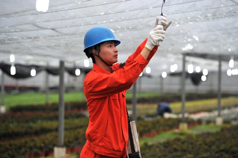 浙江省桐鄉(xiāng)市石門鎮(zhèn)白馬塘村農(nóng)業(yè)科技種植園,桐鄉(xiāng)市供電局石門供電營業(yè)所員工深入花卉茄大棚,幫助檢查設(shè)備和線路,安裝節(jié)能燈,保障用電安全,助力白馬塘村民增收。 作者:冷麗華
