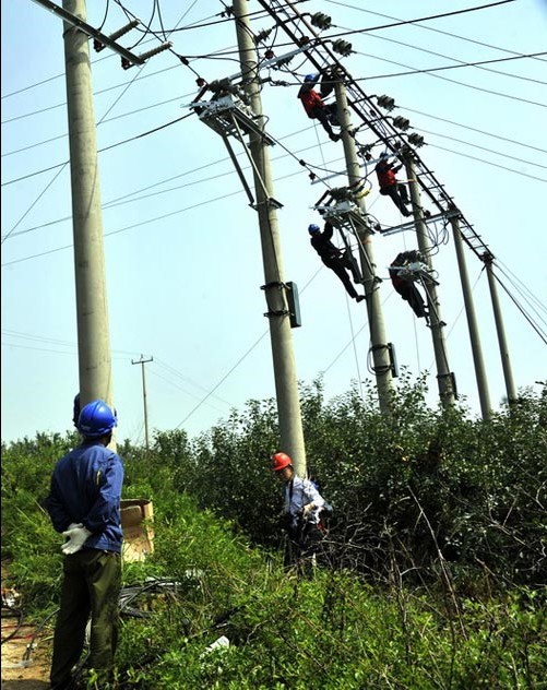 當(dāng)天室外最高溫度達到35攝氏度,毒辣的太陽照得地面上熱浪滾滾,濕透的工作服緊緊貼在每一位施工人員的身上,豆大的汗珠劃過臉龐。10多名電力職工一直奮戰(zhàn)在室外3條出線的拆卸、安裝、電纜敷設(shè)、重新架線、三基電桿的3臺智能負荷開關(guān)的安裝現(xiàn)場,緊張有序,遠遠望去,仿佛驕陽下的五線譜,壯觀動人。