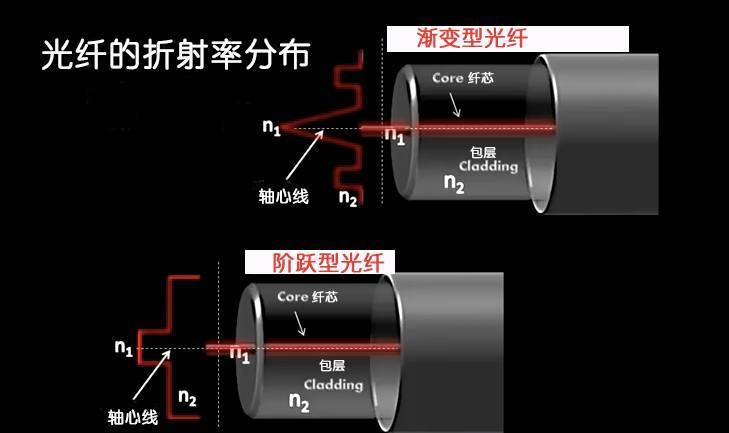 n1=纖芯折射率;n2=包層折射率,n1>n2,形成形成全反射條件。