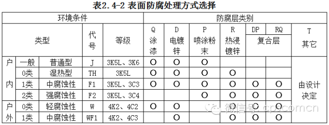鋼制橋架的表面處理方式,應按工程環(huán)境條件、重要性、耐久性和技術經(jīng)濟性等因素進行選擇。一般情況宜按表2.4-2選擇適用工程環(huán)境條件的防腐處理方式。當采用表中“T”類防腐方式為鍍鋅鎳合金、高純化等其它防腐處理的橋架,應按規(guī)定試驗驗證,并應具有明確的技術質量指標及檢測方式。