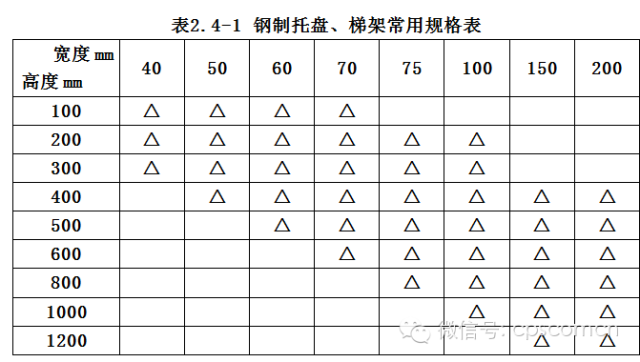 托盤、梯架直線段,可按單件標準長度選擇。單件標準長度一般規(guī)定為2、3、4、6m。托盤、梯架的寬度與高度常用規(guī)格尺寸系列如表2.4-1