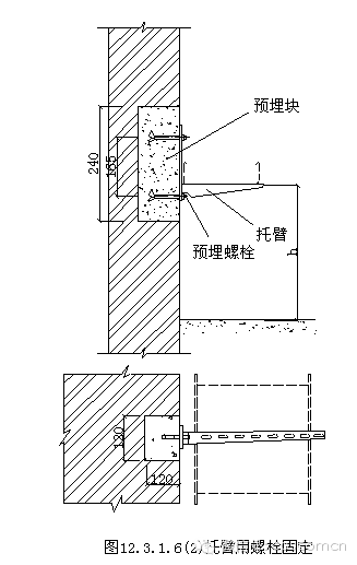 托臂是直接支承托盤、梯架單獨固定的剛性部件,托臂有螺栓固定可預埋螺栓,也可采用膨脹螺栓,也可卡接,如圖3.1.6(1)、(2)、(3)、(4)、(5)。