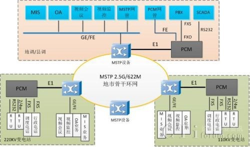 傳統(tǒng)的電力通信網(wǎng)采用MSTP/SDH設(shè)備+PCM設(shè)備組網(wǎng)如圖 1所示: