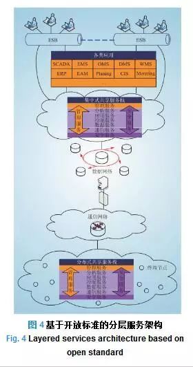 基于開放標(biāo)準(zhǔn)的分層服務(wù)架構(gòu)延續(xù)了企業(yè)服務(wù)總線的ESB集成和適配器體系架構(gòu)的中間件融合,通過開放標(biāo)準(zhǔn)將服務(wù)、業(yè)務(wù)等模塊化,以服務(wù)為中心,并結(jié)合電網(wǎng)系統(tǒng)的特點(diǎn)和業(yè)務(wù)需要將服務(wù)分類分層,形成結(jié)合集中式共享服務(wù)棧和分布式共享服務(wù)棧的分層架構(gòu),如圖 4所示。這種架構(gòu)滿足“系統(tǒng)的系統(tǒng)”的主要特征,整個(gè)系統(tǒng)由關(guān)聯(lián)的多個(gè)獨(dú)立的分布式系統(tǒng)組成,獨(dú)立在于成員系統(tǒng)的運(yùn)行和管理相互獨(dú)立,而關(guān)聯(lián)在于成員系統(tǒng)需要彼此協(xié)同實(shí)現(xiàn)系統(tǒng)功能,這種協(xié)同關(guān)系只是暫時(shí)的突發(fā)行為[15-16]。