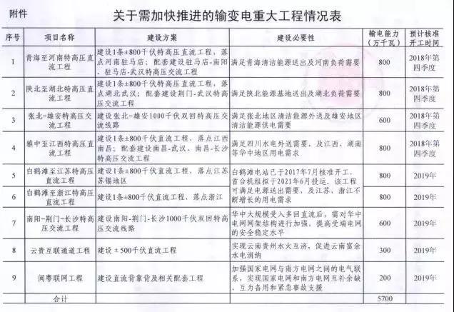 為加大基礎(chǔ)設(shè)施領(lǐng)域補(bǔ)短板力度,發(fā)揮重點(diǎn)電網(wǎng)工程在優(yōu)化投資結(jié)構(gòu)、 清潔能源消納、電力精準(zhǔn)扶貧等方面的重要作用,加快推進(jìn)白鶴灘至江蘇、白鶴灘至浙江特高壓直流等9項(xiàng)重點(diǎn)輸變電工程建設(shè)。項(xiàng)目包括了12條特高壓工程,合計(jì)輸電能力5700萬千瓦,將于今明兩年給予審核。