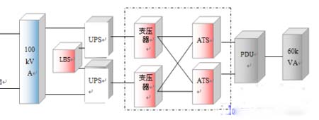 尤其是有的用戶認為可靠性是用錢堆起來的,認為設(shè)備越多可靠性越高。實際上設(shè)備越多增加的串聯(lián)環(huán)節(jié)就越多,相應(yīng)地可靠性也越低!如圖9所示就是高頻機型UPS供電臃腫系統(tǒng)的一個例子,說它臃腫是因為這本來是一個很節(jié)能的供電系統(tǒng),兩臺高頻機型UPS冗余并聯(lián)后給負載供電,簡單明了??蓡螁卧O(shè)計者又給UPS后面串聯(lián)了大功率變壓器,又串入了兩臺大容量STS,致使效率至少損失了4%~5%,不但投資增加很多,占地面積也大為增加。為什么會這樣規(guī)劃呢?原因是設(shè)計者機械地理解了美國的G4標(biāo)準(zhǔn),認為只有做成所謂的雙總線,系統(tǒng)才可靠,這就陷入了用過多設(shè)備堆積可靠性的誤區(qū)。實際上圖9的每一路供電路徑上多了兩個故障點:變壓器和STS.可靠性下降了數(shù)倍。世界上十全十美的東西太少了,就是說,增加了這方面的功能卻犧牲了另一方面的功能,這就是有得有失的道理。