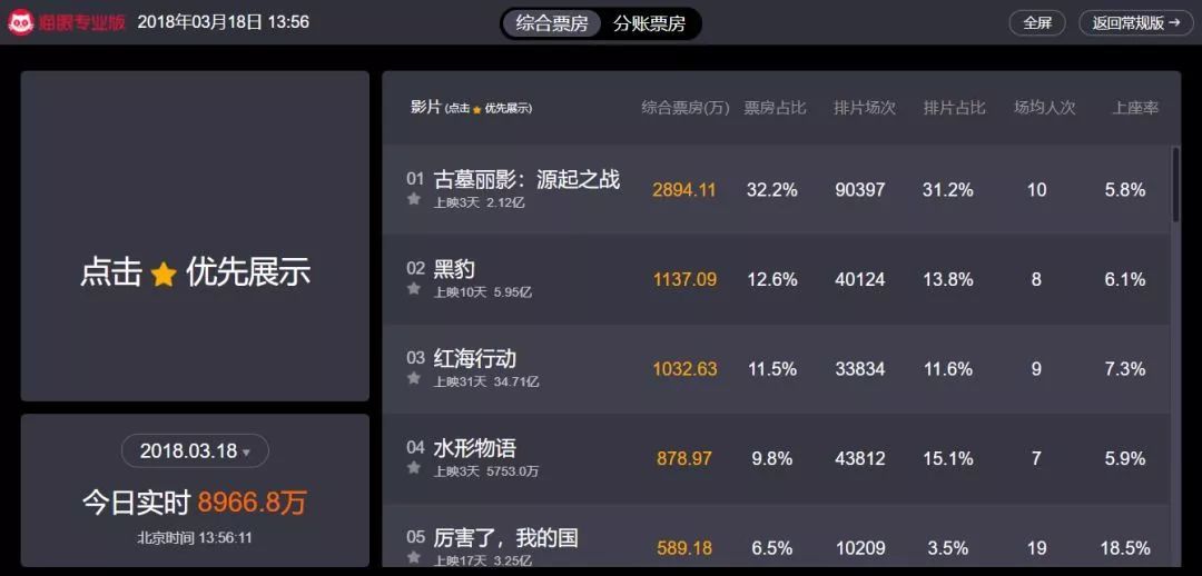 貓眼票房專業(yè)版,可以查看當前所有播放電影的實時票房情況,如下圖所示: