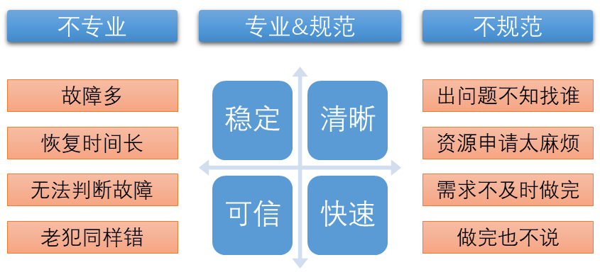 隨著業(yè)務(wù)發(fā)展,運(yùn)維的非專業(yè)性問題開始凸顯,這時(shí)候運(yùn)維強(qiáng)調(diào)專業(yè)分工和運(yùn)維作業(yè)規(guī)范且利用工具進(jìn)行業(yè)務(wù)調(diào)度,滿足運(yùn)維的方便透明、快速響應(yīng)、過程預(yù)警及質(zhì)量監(jiān)督的管理需求。