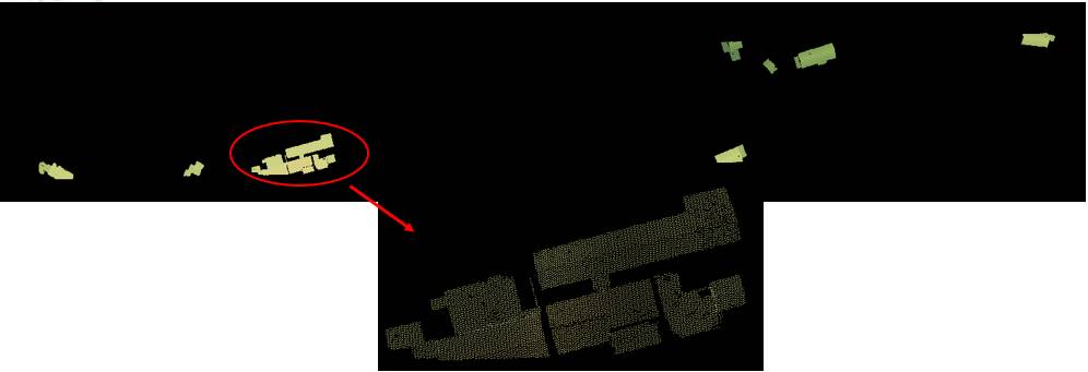 圖7 建筑物點(diǎn)云提取結(jié)果(上圖:原始點(diǎn)云,下圖:建筑點(diǎn)云提取結(jié)果)