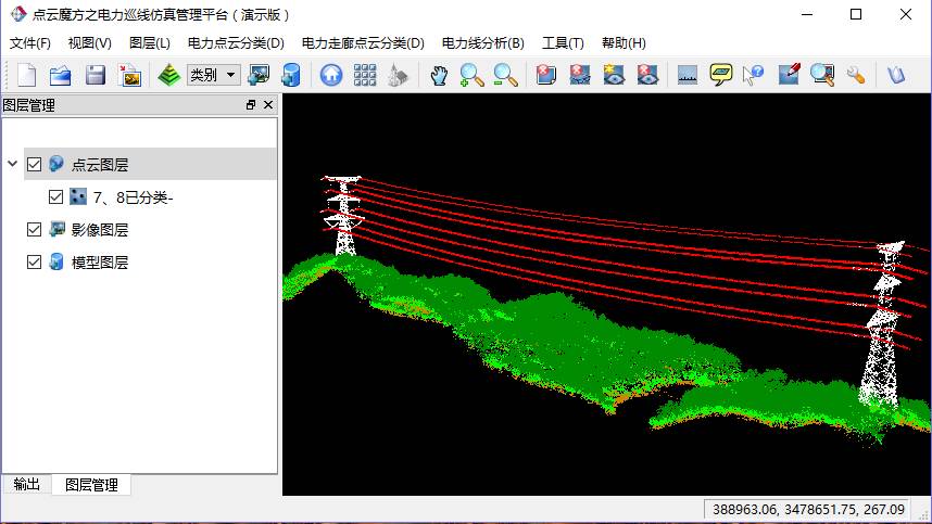 該軟件主要包括四大核心模塊:電力走廊激光點(diǎn)云數(shù)據(jù)三維渲染模塊、點(diǎn)云數(shù)據(jù)分類模塊、電力線模擬分析模塊和人工交互模塊。軟件在實(shí)現(xiàn)海量電力線走廊激光點(diǎn)云數(shù)據(jù)三維渲染的同時(shí),兼具電力走廊點(diǎn)云高效自動(dòng)分類功能,目前可分六類地物(電力線、電塔、地面、低植被、高植被、建筑和道路)。電力分析模塊不僅具有電力線三維重建功能,還具有對(duì)實(shí)時(shí)工況和模擬工況的分析功能,以交跨點(diǎn)、危險(xiǎn)點(diǎn)分析報(bào)表和電力行業(yè)橫斷面輸出為載體,助力電力巡檢行業(yè)的數(shù)字化進(jìn)程。