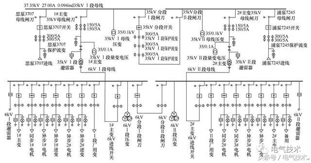 水廠內(nèi)的所有重要負(fù)載平衡分布在兩段上,6kV Ⅰ段的負(fù)載有1#新變(第二泵房變壓器1#變壓器)、同步1#電機(jī)、異步1#電機(jī)、異步1#逆變、異步2#電機(jī)、異步2#逆變、以及Ⅰ段廠用變,6kV Ⅱ段的負(fù)載有2#新變(第二泵房變壓器2#變壓器)、異步3#逆變、異步3#電機(jī)、同步3#電機(jī)、同步2#電機(jī)、以及Ⅱ段廠用變。