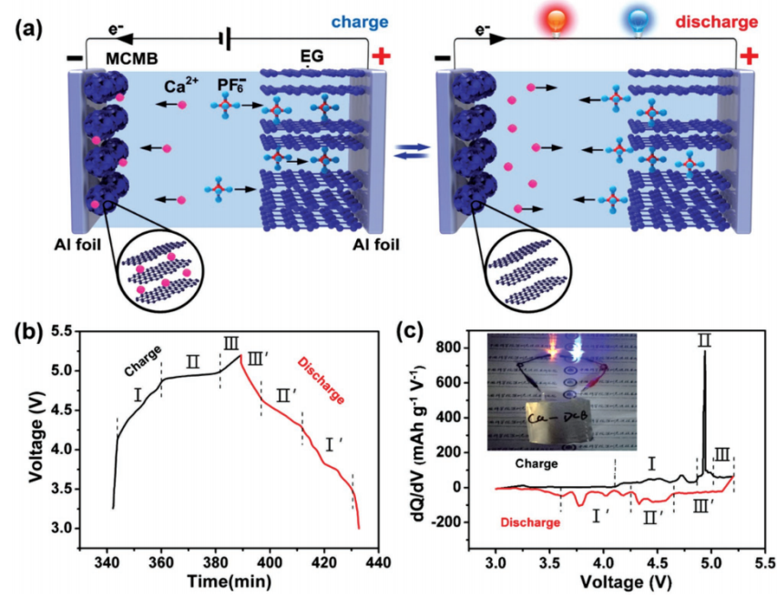 鑒于此,唐永炳及其團(tuán)隊(duì)成員吳石、張帆等人成功研發(fā)出一種基于雙碳結(jié)構(gòu)的鈣型雙離子電池。該電池材料廉價(jià)易得并且環(huán)保,采用膨脹石墨作為正極材料,PF6-陰離子可以在其片層結(jié)構(gòu)中可逆地嵌入/脫出;采用中間相碳微球作為負(fù)極材料,Ca2+可以在其片層結(jié)構(gòu)中可逆地嵌入/脫出。電解液采用基于六氟磷酸鈣做電解質(zhì)的碳酸酯類電解液。研究表明,該鈣型雙離子電池可以在室溫下實(shí)現(xiàn)可逆充放電,并且表現(xiàn)出優(yōu)異的電化學(xué)性能:平均工作電壓高達(dá)4.6V,1C倍率下循環(huán)300圈后容量保持率為94%。這種新型鈣離子電池結(jié)構(gòu)設(shè)計(jì)為鈣離子電池的研究開(kāi)拓了新思路,也為基于多價(jià)金屬離子電池的研究提供了借鑒意義。