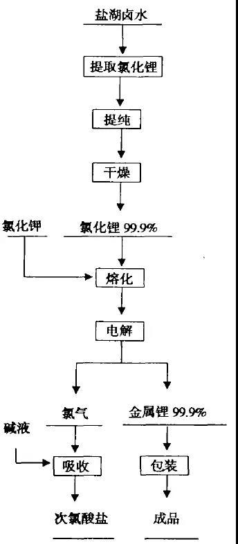 金屬鋰的制作分為兩大類:熔鹽電解法和真空熱還原法。當(dāng)前金屬鋰的工業(yè)生產(chǎn)方法是氯化鋰-氯化鋰熔鹽電解法,電解質(zhì)中氯化鋰為55%,氯化鋰為45%。具體工藝流程如圖: