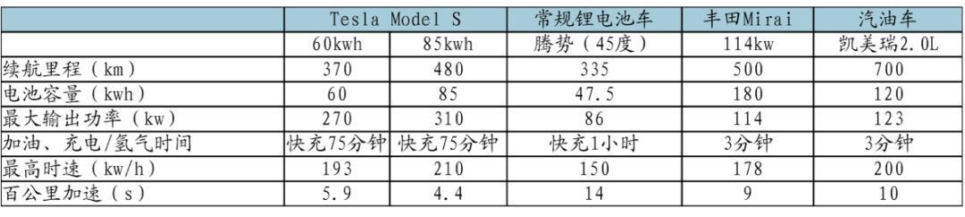 主流FCV參數(shù)對(duì)比