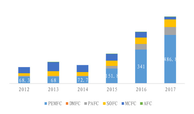 從出貨兆瓦數(shù)來(lái)看,PEMFC的單體發(fā)電量從2012年開(kāi)始出現(xiàn)較為明顯的提升,由12年的1.7KW/套提升至17年的10.7KW/套。