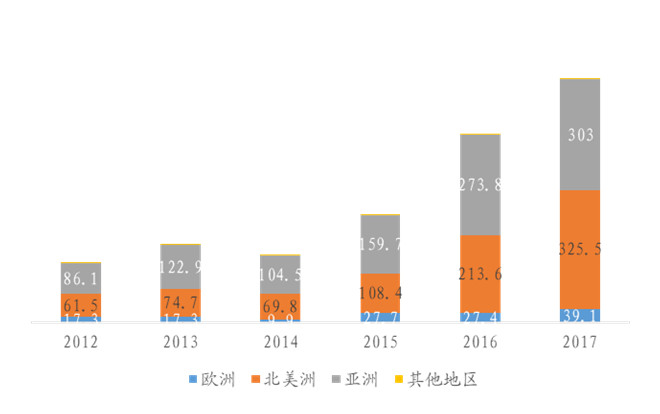 從全球各地區(qū)的出貨兆瓦數(shù)來(lái)看,目前北美與亞洲的燃料電池市場(chǎng)呈現(xiàn)分庭抗禮的局面,17年北美的出貨兆瓦數(shù)甚至高于亞洲(北美:325.5MWvs亞洲:303MW)。